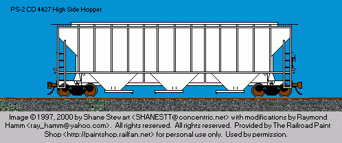 PS-2 CD 4427 high-side covered hopper drawing © 1997, 2000 by Shane Stewart with modifications by Raymond Hamm. All rights reserved. Used by permission. If you would like to use this image, or a painted version of it on your web site, you may do so, providing that you notify the artist and place a link back to The Railroad Paintshop. Linking directly to the image on the Railroad Paint Shop site is prohibited. If you want to use the image in any other form of publication, you must have the prior written permission of the artist.
