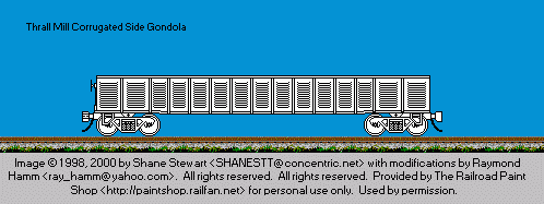 Thrall corrugated-side mill gondola drawing © 1998, 2000 by Shane Stewart with modifications by Raymond Hamm. All rights reserved. Used by permission. If you would like to use this image, or a painted version of it on your web site, you may do so, providing that you notify the artist and place a link back to The Railroad Paintshop. Linking directly to the image on the Railroad Paint Shop site is prohibited. If you want to use the image in any other form of publication, you must have the prior written permission of the artist.