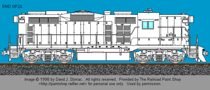 GP20 drawing © 1998 by David J. Stimac. All rights reserved. Used by permission. If you would like to use this image, or a painted version of it on your web site, you may do so, providing that you notify the artist and place a link back to The Railroad Paintshop. Linking directly to the image on the Railroad Paint Shop site is prohibited. If you want to use the image in any other form of publication, you must have the prior written permission of the artist.